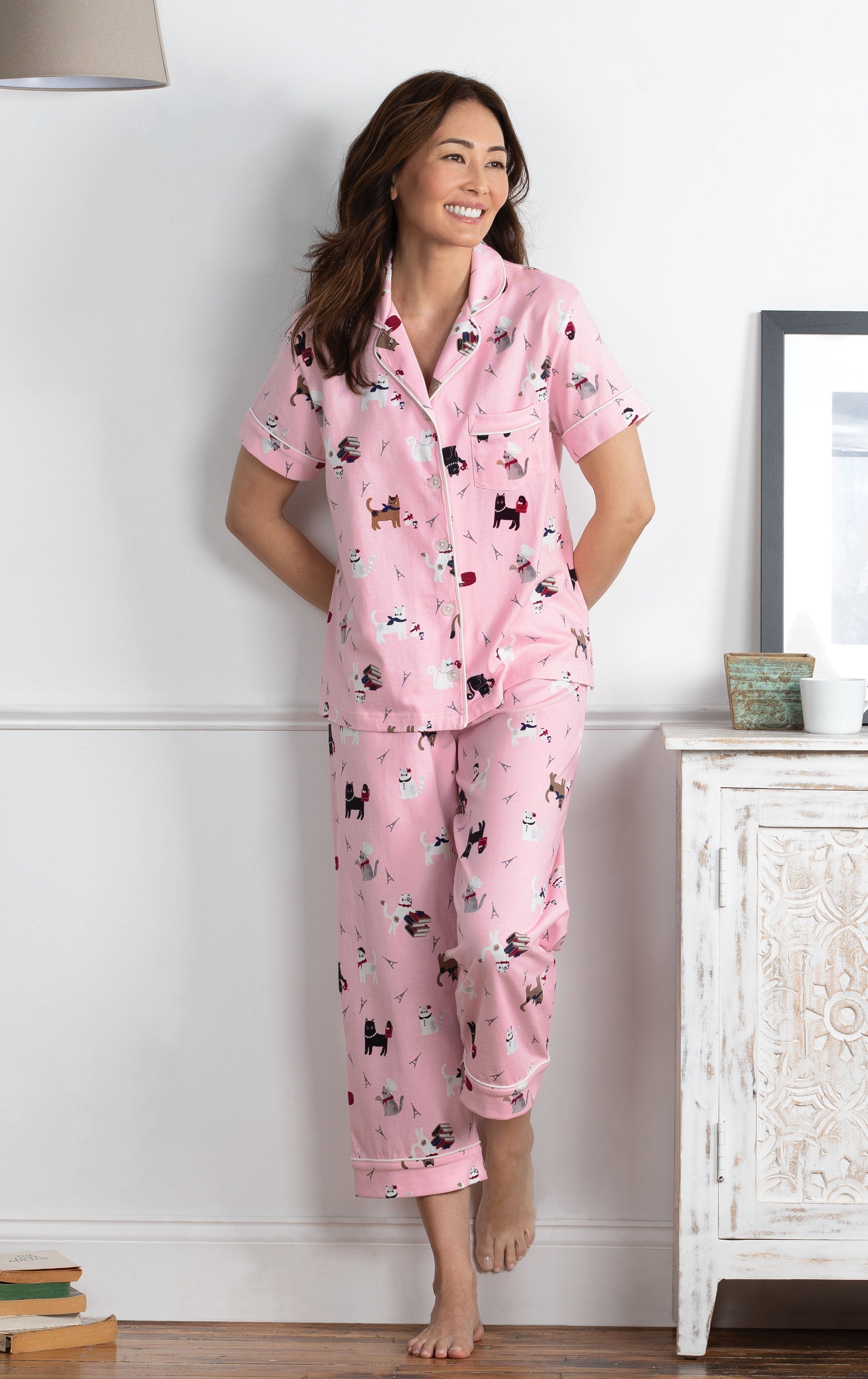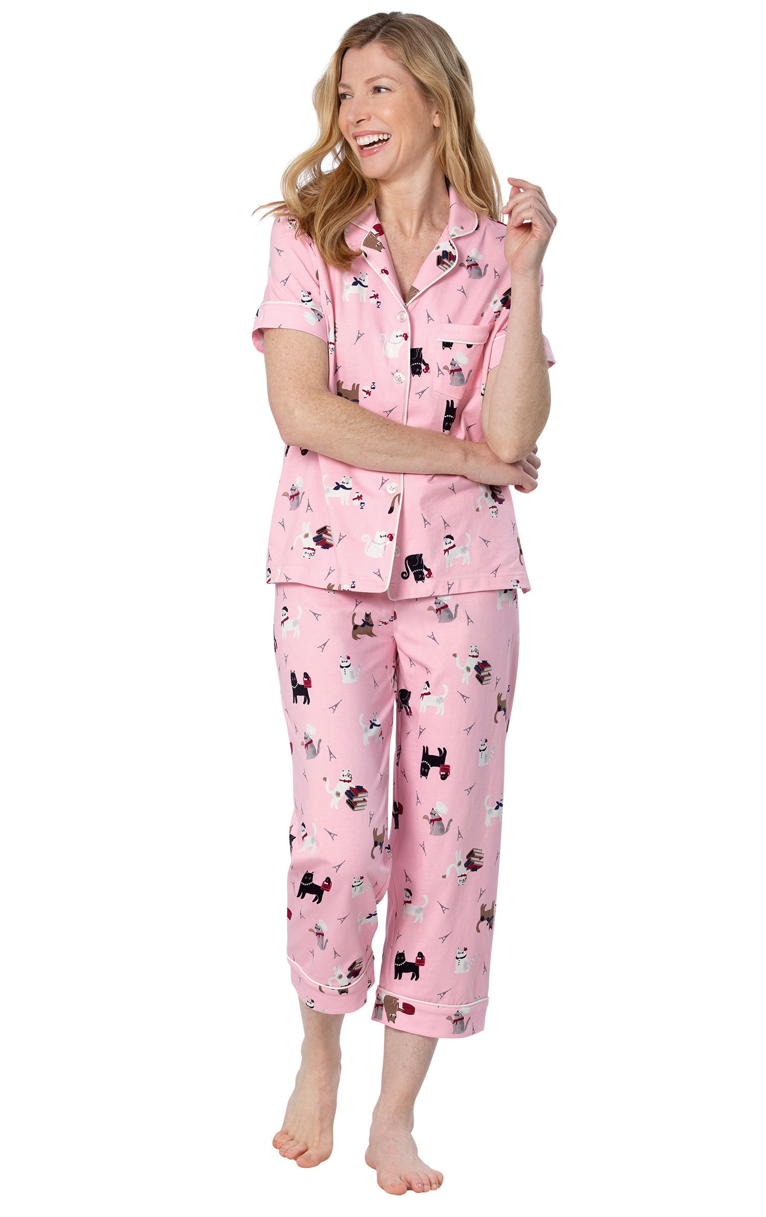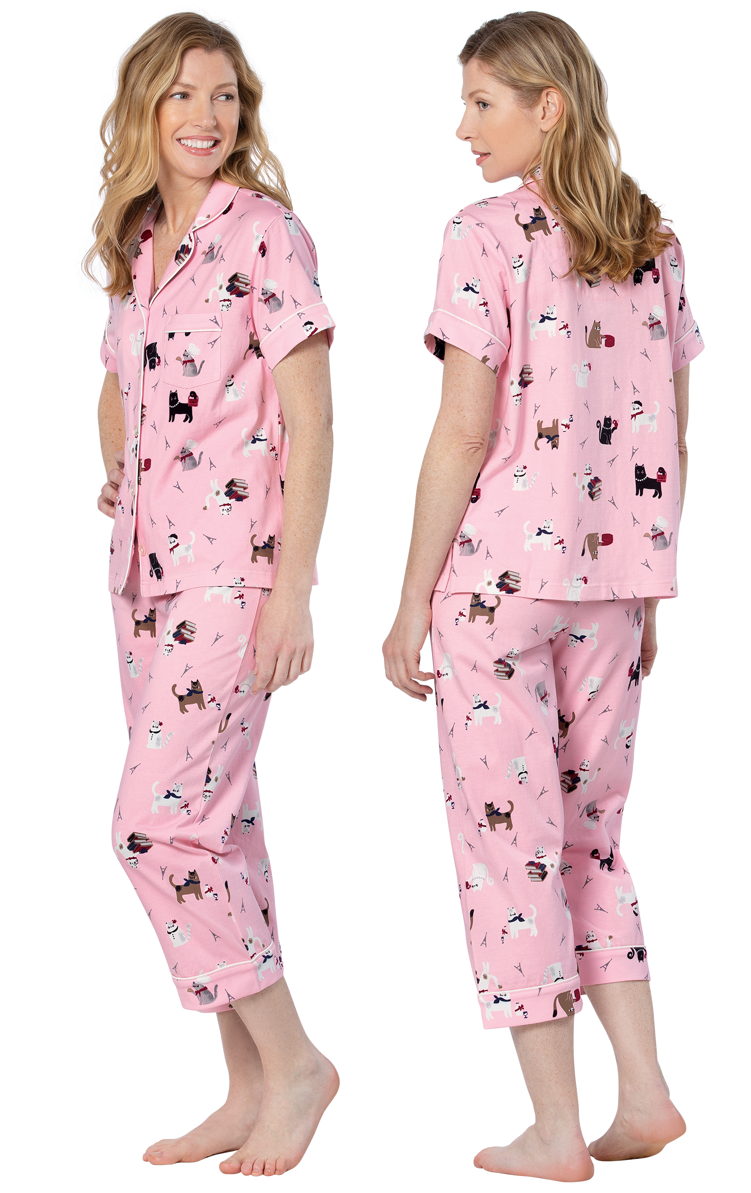 Soft cotton jersey Women's Pajamas blend the romance of Paris with the cuteness of kitties for a purr-fect balance of comfort and style. Unique short-sleeve pajama set paints a masterpiece of comfort and lasting relaxation with a double-brushed fabric treatment and classic button-up styling. Includes a notched collar, chest pocket and cropped pants with an elastic, drawstring waist.