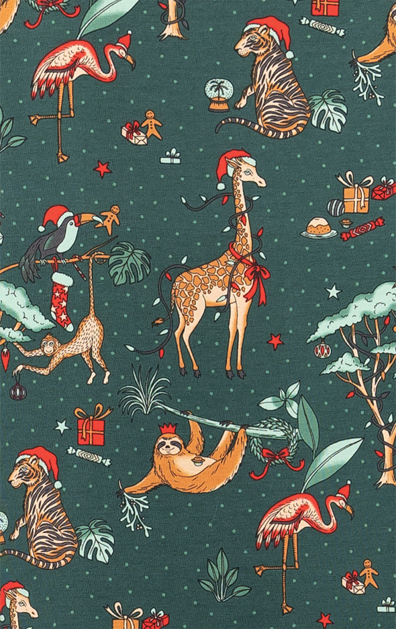Boasting an exclusive, jungle animal, tree, and leaf-inspired scene infused with Santa hats, the Christmas Safari Youth Pajamas are perfect for getting cozy during the holidays and beyond. Made from a soft-as-can-be, slightly stretchy jersey, this snug fit set includes a long-sleeve top with a round neckline and legging pants. Bound to be an all-time favorite, from relaxed evenings to nights dreaming and cozy mornings, these pajamas are comfort at its best.
