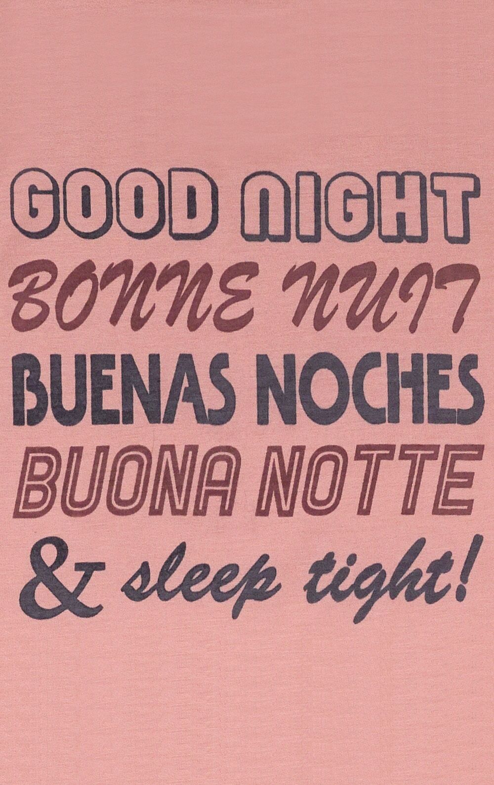 - Shirt reads "Goodnight" in many langauges