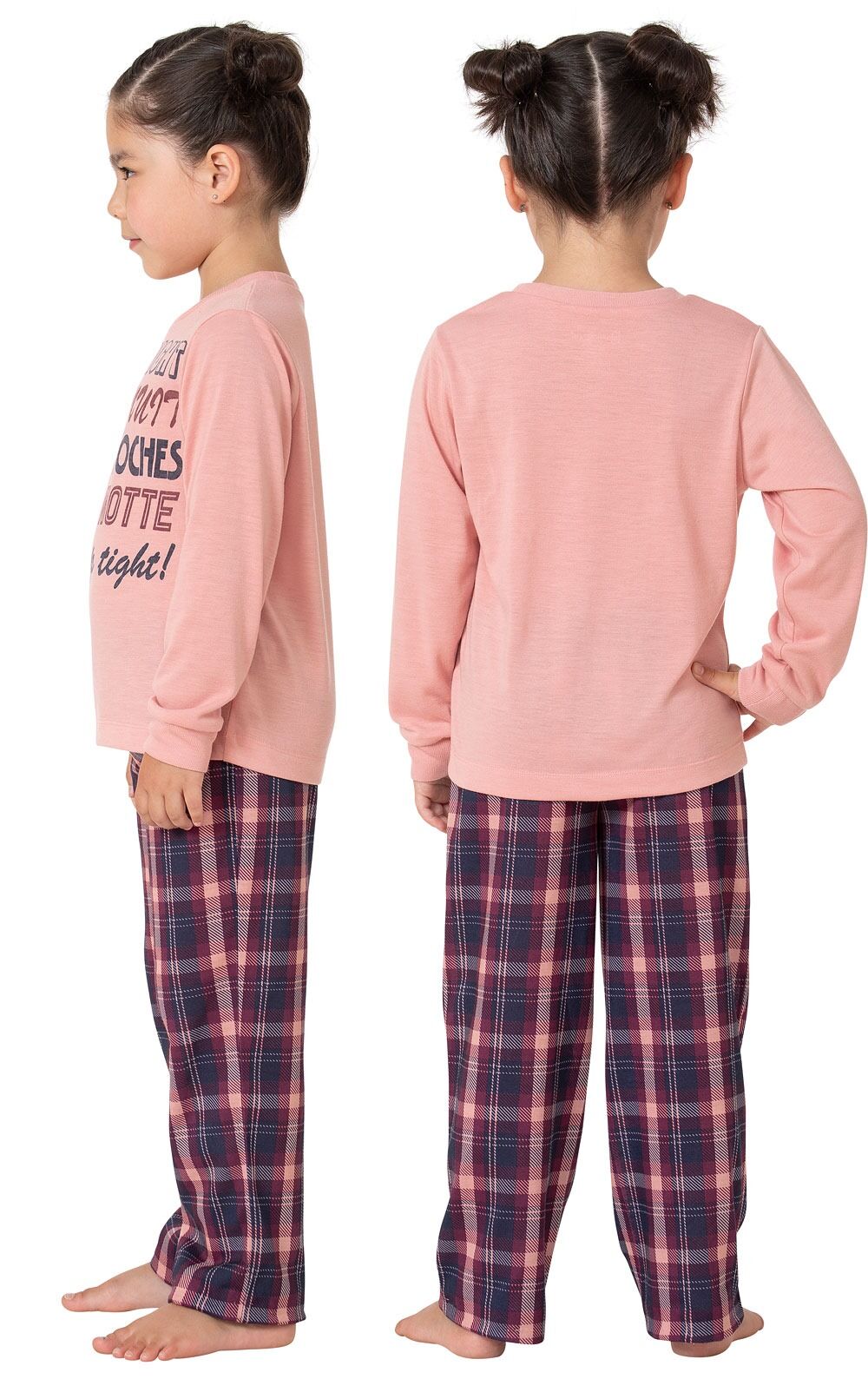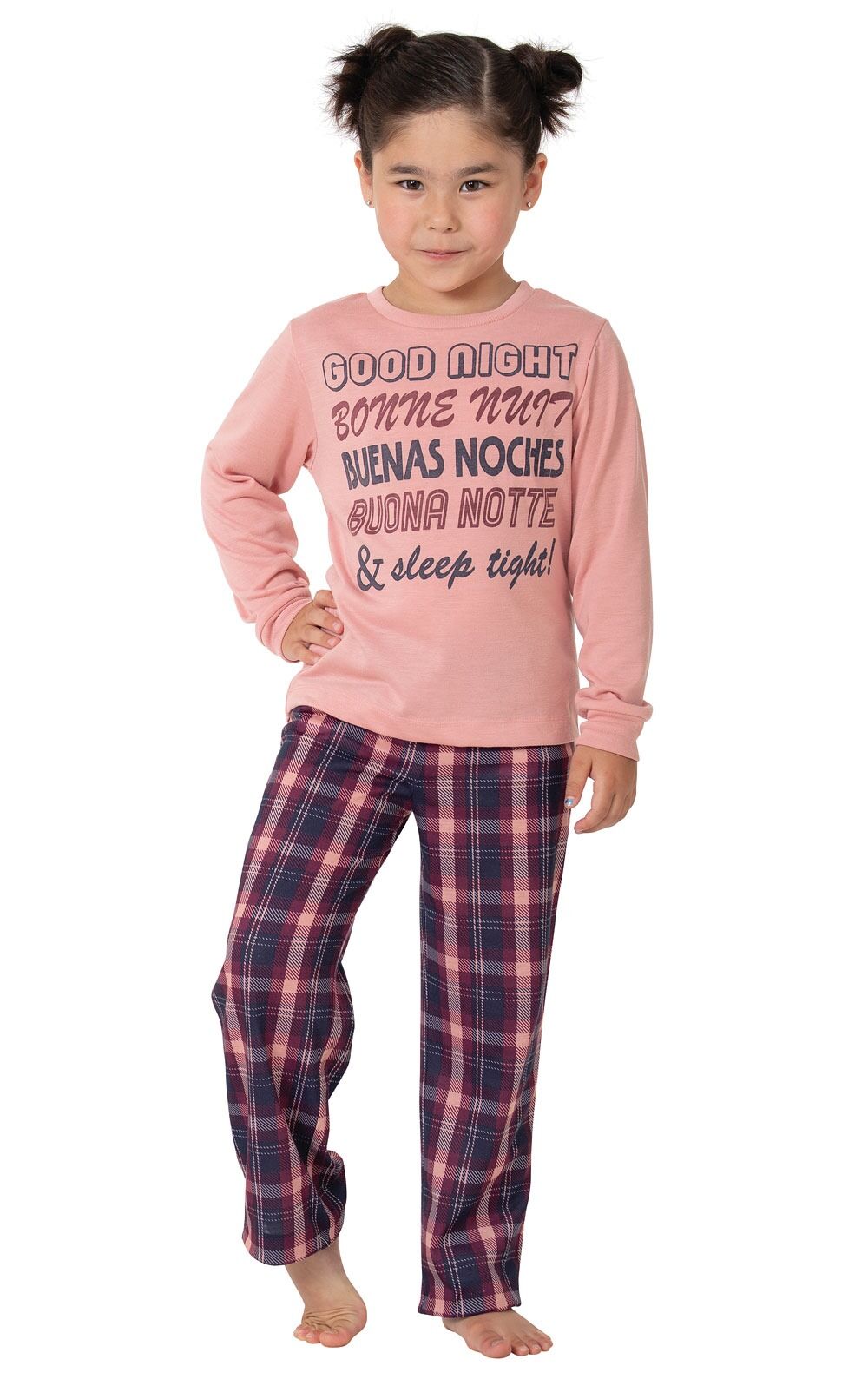 Make bedtime a little brighter with soft, jersey pajamas. Featuring plaid pants in plum tones and a top that reads "Goodnight" in many languages, the look and feel of this set offers the perfect weight to be worn year-round. Elastic waist and machine washable fabric makes them easy to care for and easy to pass down.