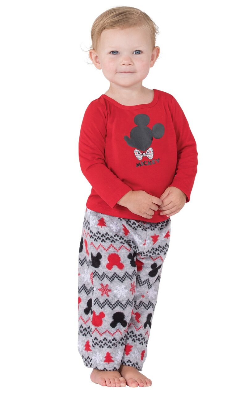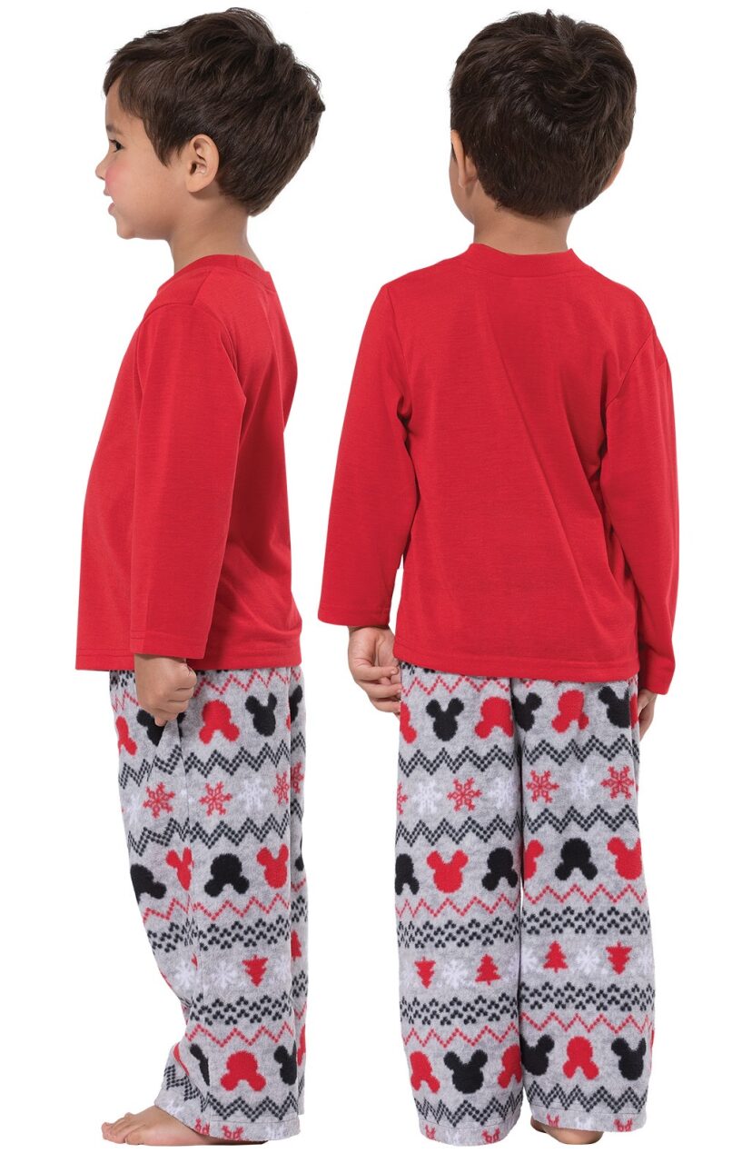 Oh, boy! Look at these great Mickey Mouse Pajamas! Long-sleeved, crew neck top with Mickey Mouse graphic matches perfectly with ultra-soft, micro-fleece pants that feature a Nordic-inspired winter print with the iconic mouse ears in red and black.
