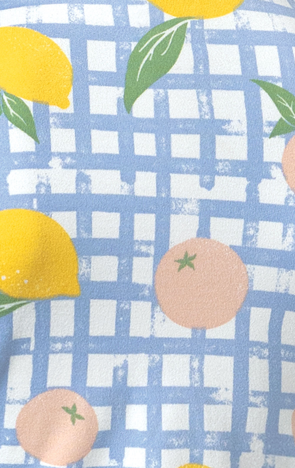 Squeeze the day, sleep the night away with the Countryside Gingham Toddler Pajamas. Made of a delightfully soft, breathable fabric, this snug fitting set includes a long sleeve, a crew neckline top and flat waistband, legging bottoms. Boasting a sweet-as-can-be blue gingham pattern decorated with citrus fruits, these pajamas make savoring life's little moments truly magical.