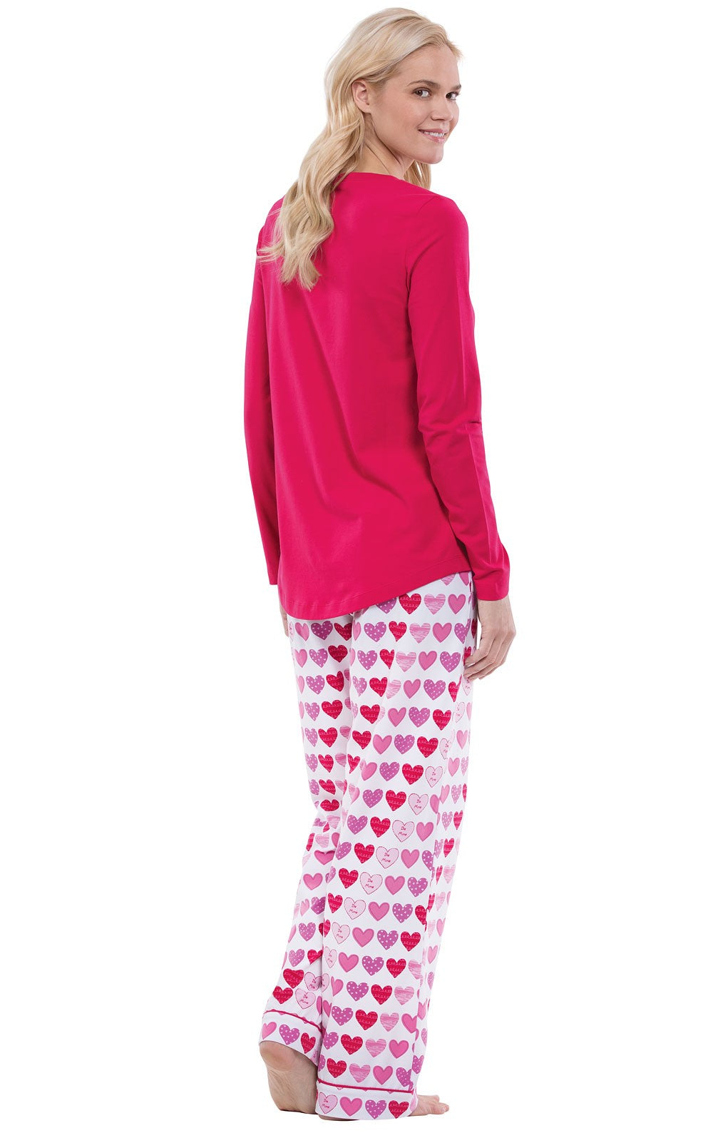 Soft cotton jersey is sweeter than ever with hundreds of red and pink hearts. These precious PJs show undying affection for comfort, featuring a long-sleeve, scoop-neck top with a "Be Mine" heart print and curved back hem for extra love and coverage. Full-length pants with an elastic, drawstring waist and contrast piping offer a relaxed feel and subtle style.