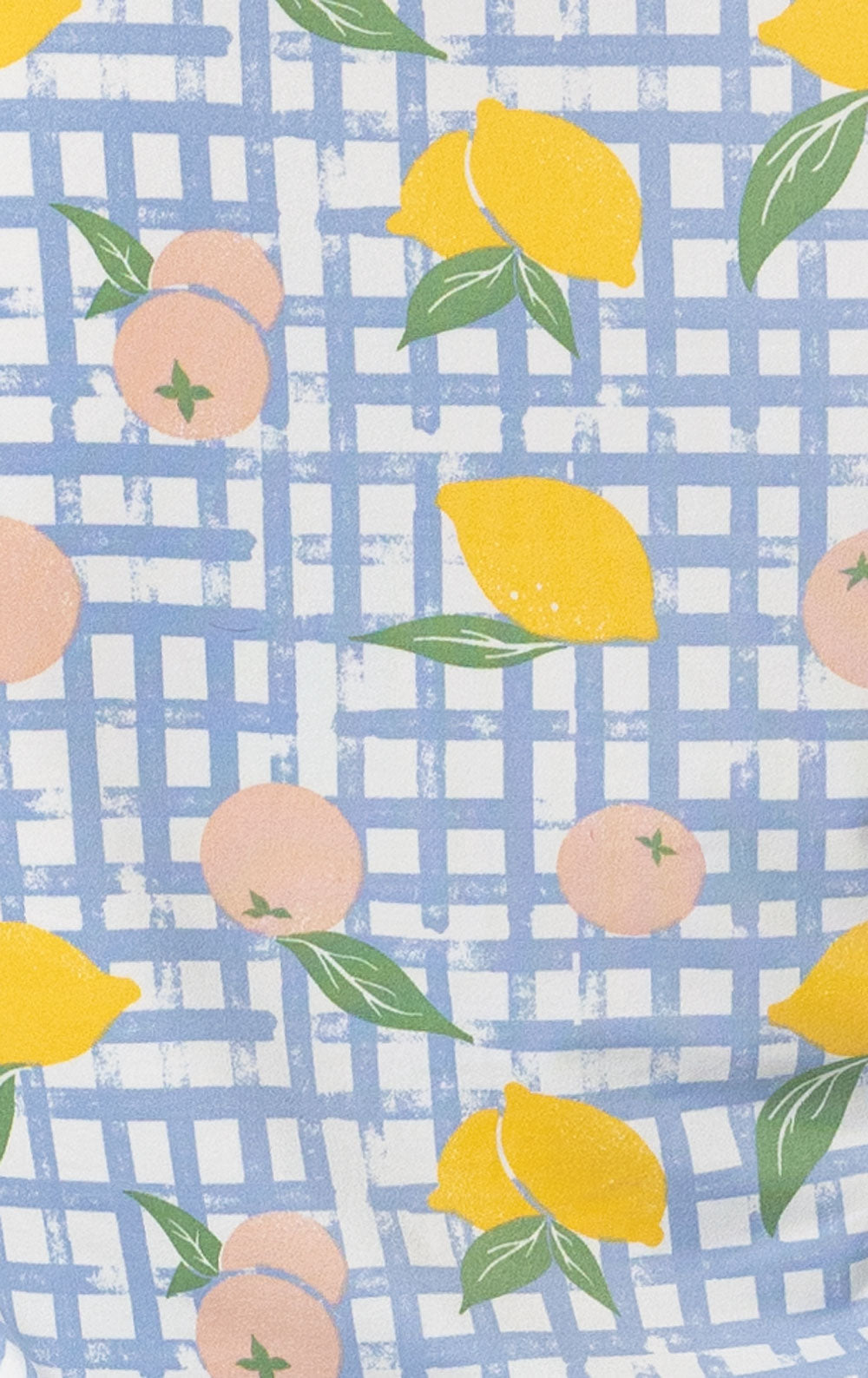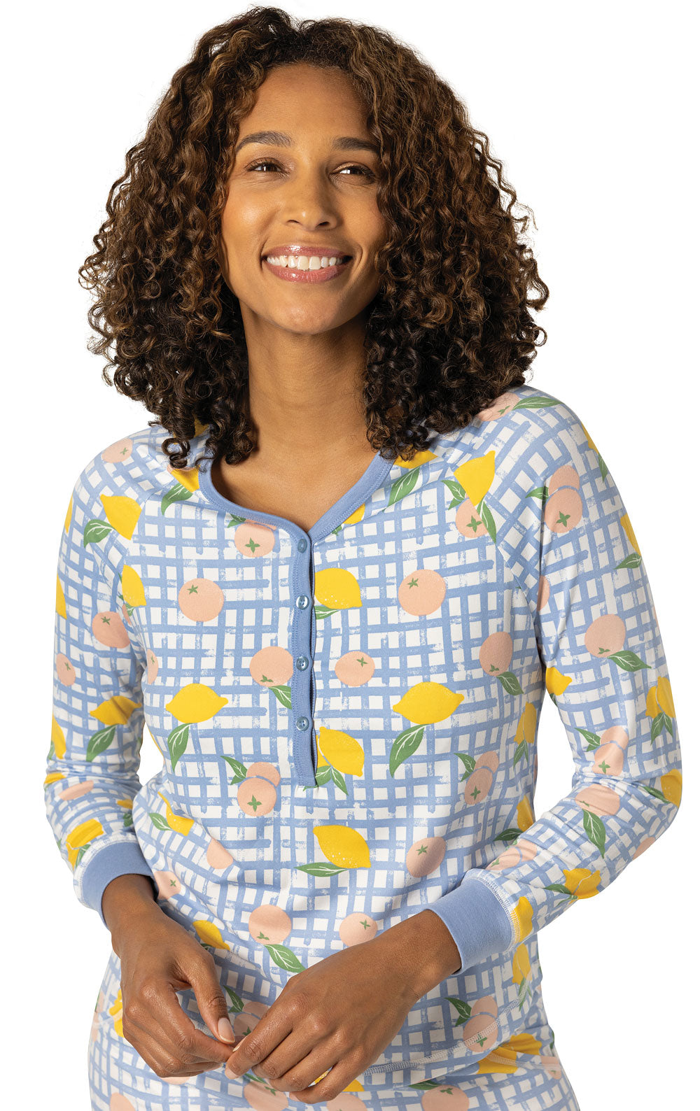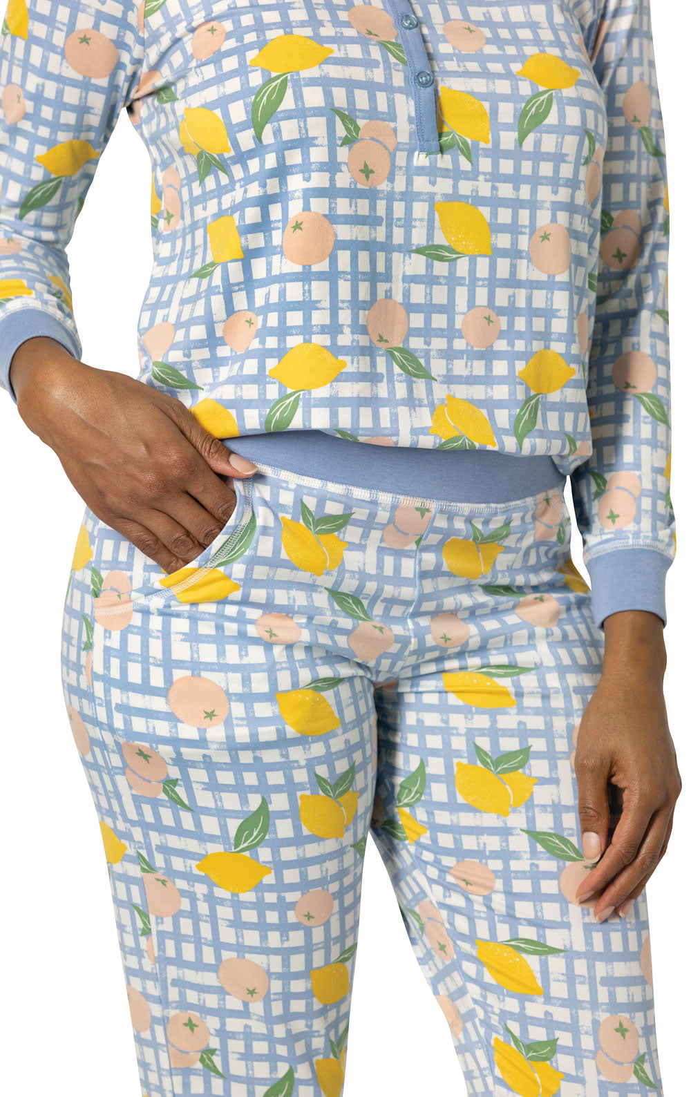 Squeeze the day, sleep the night away with the Countryside Gingham Jogger Pajamas. Made of a delightfully soft, breathable fabric, this set includes a long sleeve, a henley neckline top with front pockets, flat waistband, jogger pants. Boasting a sweet-as-can-be blue gingham pattern decorated with citrus fruits, these pajamas make savoring life's little moments truly magical.