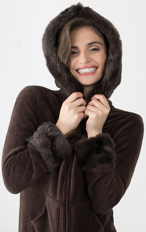 - Faux-fur trimmed cuffs and adjustable hood; kangaroo pocket