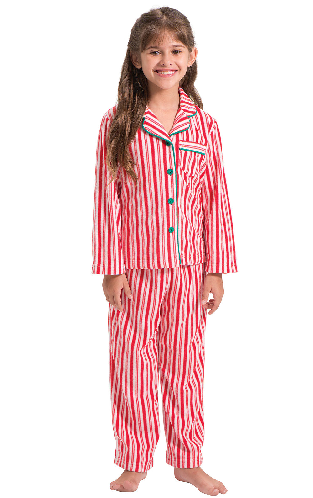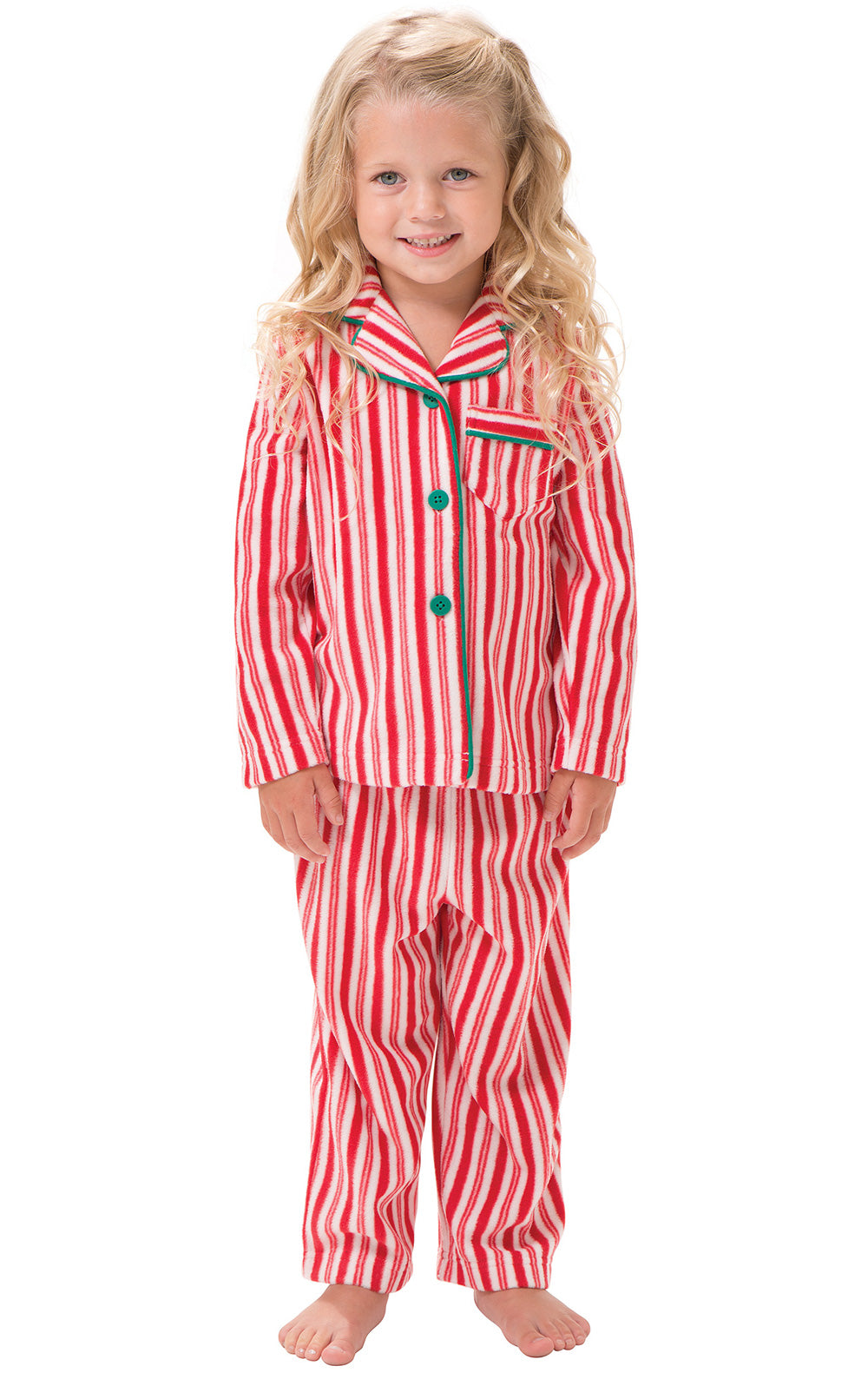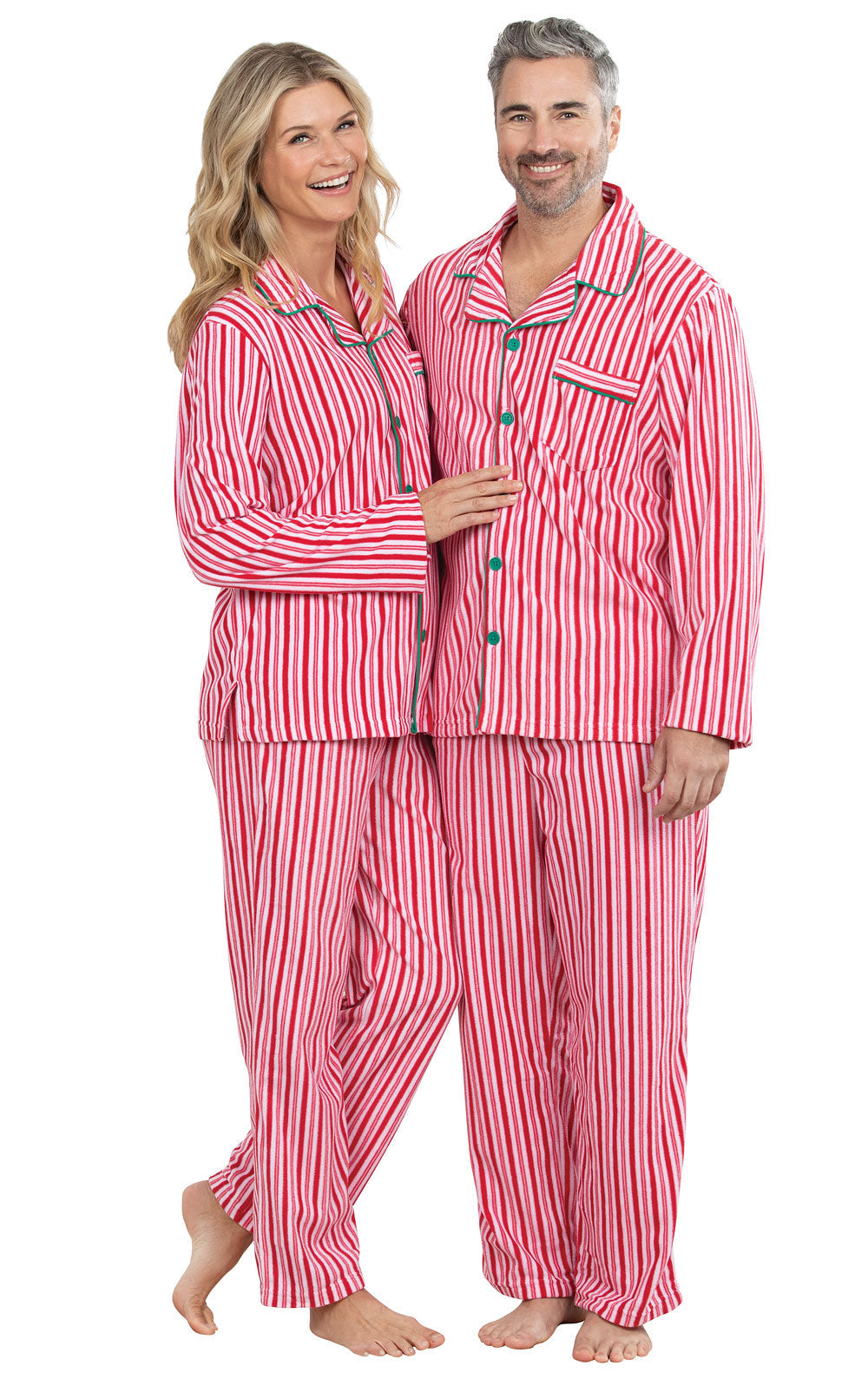 Made of featherweight fleece to be fluffy soft and toasty warm, these pajamas will keep any couple cozy. Matching set includes warm pajamas in a candy cane stipe print with green trim, buttons and drawstring. A perfect gift for now that will be loved for years.