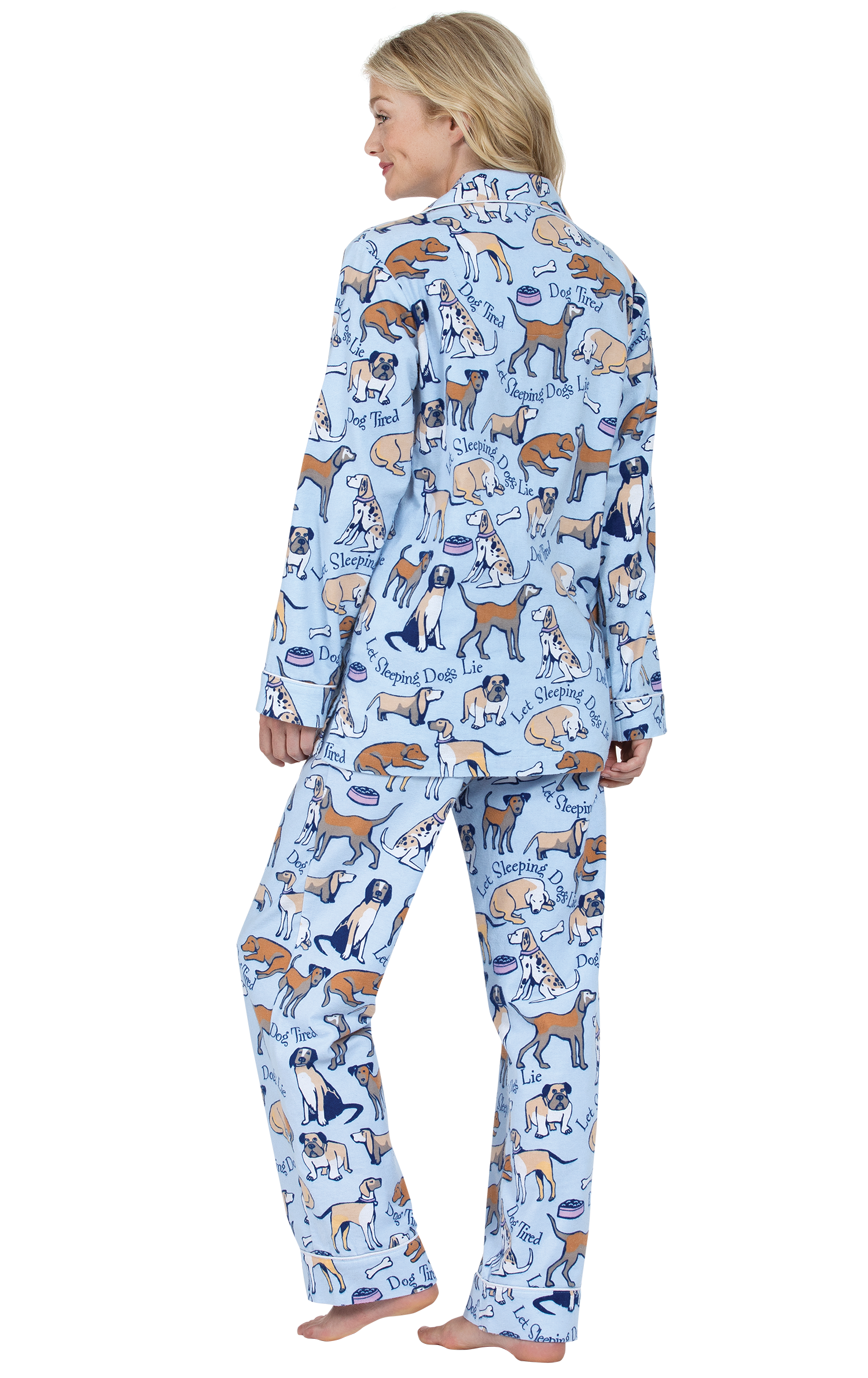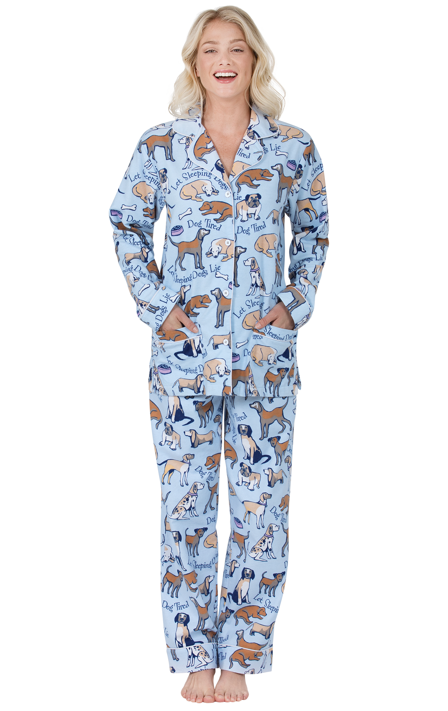 Even the ruff-est days end well with these adorable brushed flannel PJs in trending Boyfriend style. A most endearing gift for dog lovers, the print features the classic dog phrases "Dog Tired" and "Let Sleeping Dogs Lie" on a button-up front with hip pockets and white piping. The PJ fabric is high-quality fabric that means color stay bright, wash after wash. It is a comfy mid-weight fabric that is breathable but never see through.