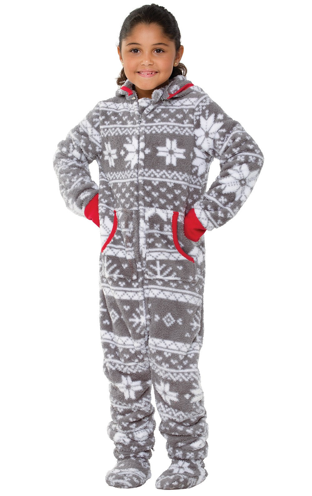 Destined to be an all-time favorite, this mid-weight fleece Hoodie-Footie for Kids looks as cozy as it feels thanks to a Nordic-inspired motif. Fashioned with red rib-knit accents, a zip front, warm footie feet with non-skid soles, kangaroo pockets and thumbholes for complete look-good, feel-good comfort at bedtime.