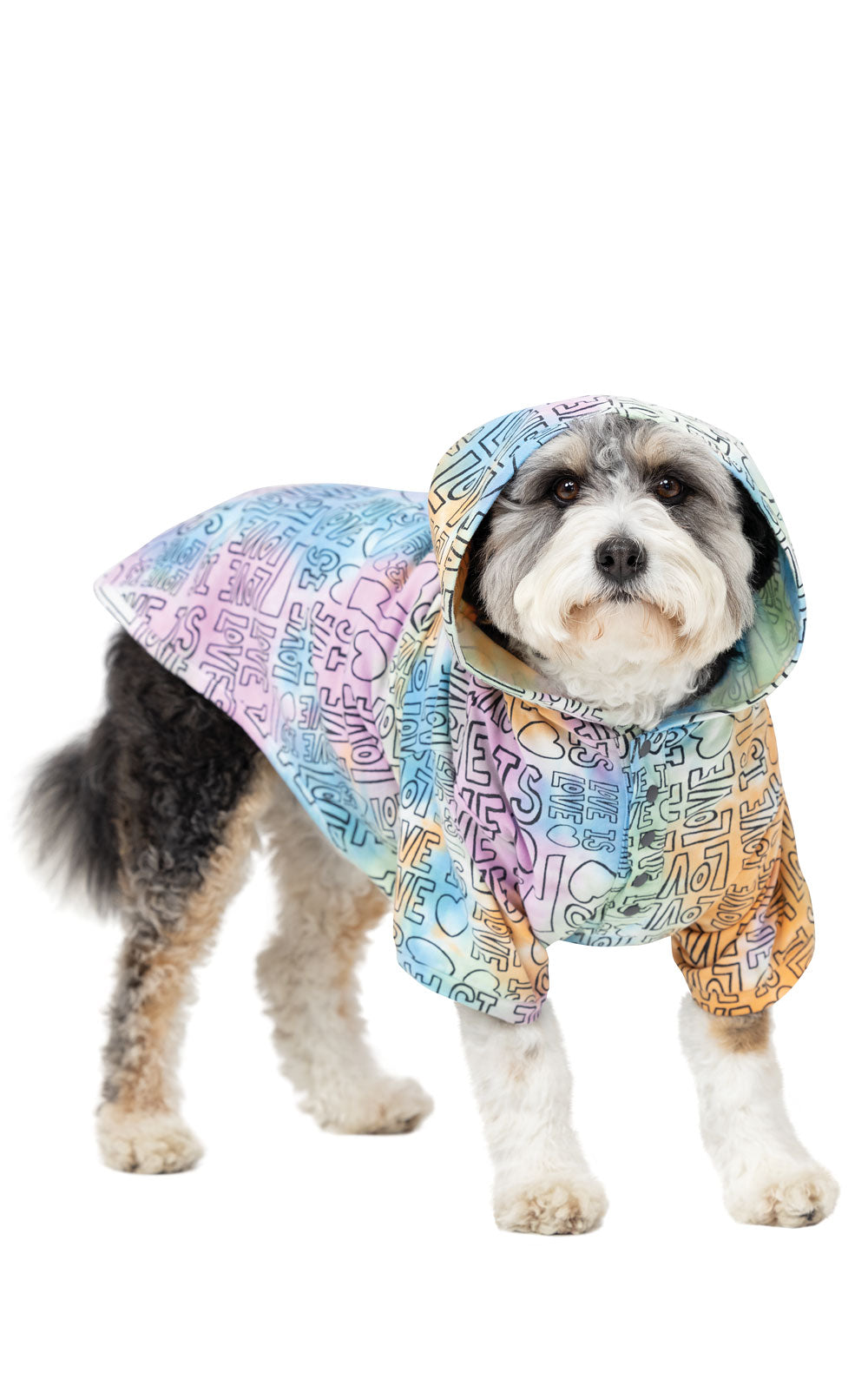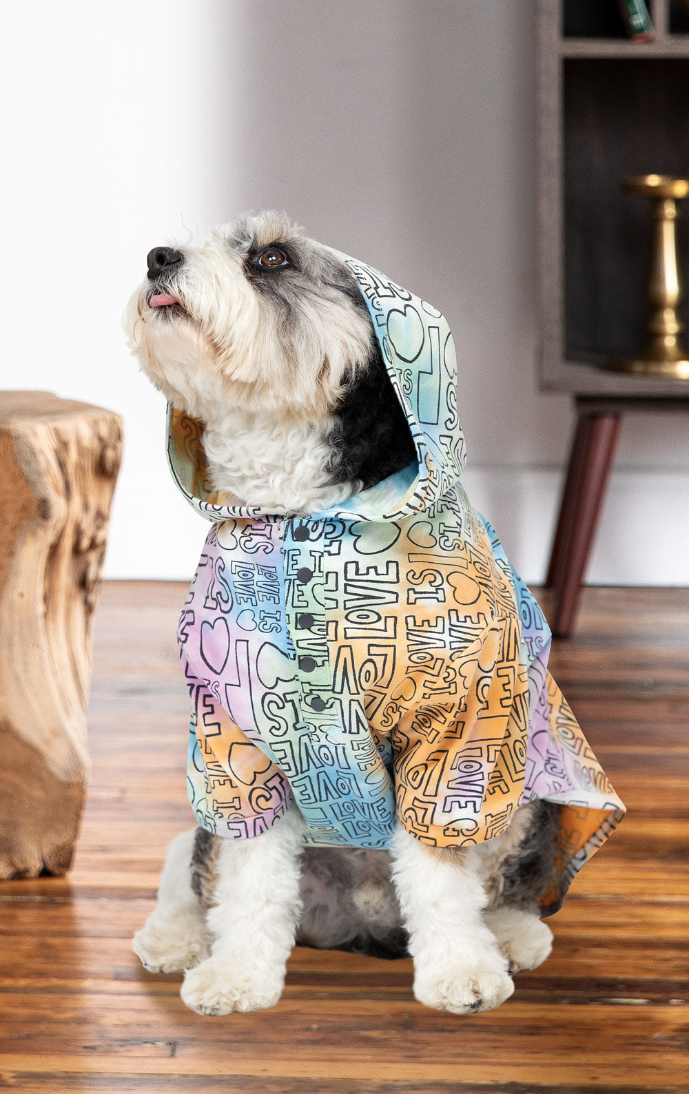 Here's a cheer for love, regardless of what it looks like. The Love is Love pet pajamas are not just brightly colored with an all-over awe-inspiring print, they are incredibly relaxing to wear. The slightly stretchy jersey with a button-front hoodie makes this short sleeve top easy to put on and take off. Love for your pet is love too!